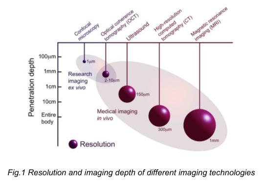 光學(xué)相干斷層掃描(OCT: optical coherence tomography)是一種非侵入式光學(xué)成像技術(shù),可提供實(shí)時(shí)、1維深度、2維截面或3維立體圖像,分辨率可達(dá)微米量級(jí)(~um),成像深度為毫米量級(jí)(~mm)。如圖1所示,如果以分辨率和成像深度兩個(gè)方面來(lái)討論,OCT成像技術(shù)填補(bǔ)了共焦顯微鏡和超聲技術(shù)之間的空白。