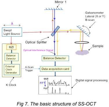 SS-OCT系統(tǒng)利用掃頻光源和光電探測(cè)器快速生成干涉圖。由于掃描激光源快速掃描分時(shí)產(chǎn)生不同波長(zhǎng)的光,可允許每個(gè)離散波長(zhǎng)以比較高的光功率照射到樣品上,能夠獲得更高的接收靈敏度的而避免發(fā)生光學(xué)損傷。