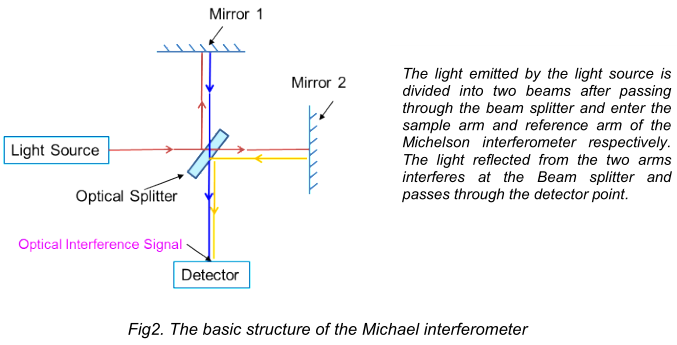 OCT基于光學(xué)相干原理,以近紅外光為光源,邁克爾遜干涉儀為核心光學(xué)結(jié)構(gòu),產(chǎn)生光學(xué)干涉信號(hào)實(shí)現(xiàn)成像。圖2介紹了邁克爾遜干涉儀的基本結(jié)構(gòu)。